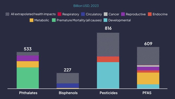 Pesticides alone account for US$816bn in avoidable annual health costs, followed by phthalates at US$609bn, bisphenols at US$533bn and PFAs at US$227bn.
